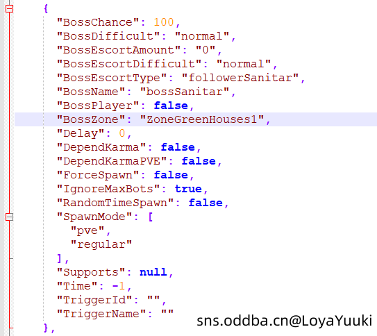 起因是和朋友在联机的时候想要调整boss的数量,在进行地点调整的时候发现同一个地点对应多个坐标,于是想尝试自定义boss的刷新位置来确定每个坐标。暂时是打算先对别墅区进行测试,目前将其中一个ZoneGreenHouses的坐标定义为ZoneGreenHouses1,并将sanitar的刷新位置也设定为ZoneGreenHouses1,但是sanitar还是会随机刷新。想问问大伙有没有办法让boss定位刷新。