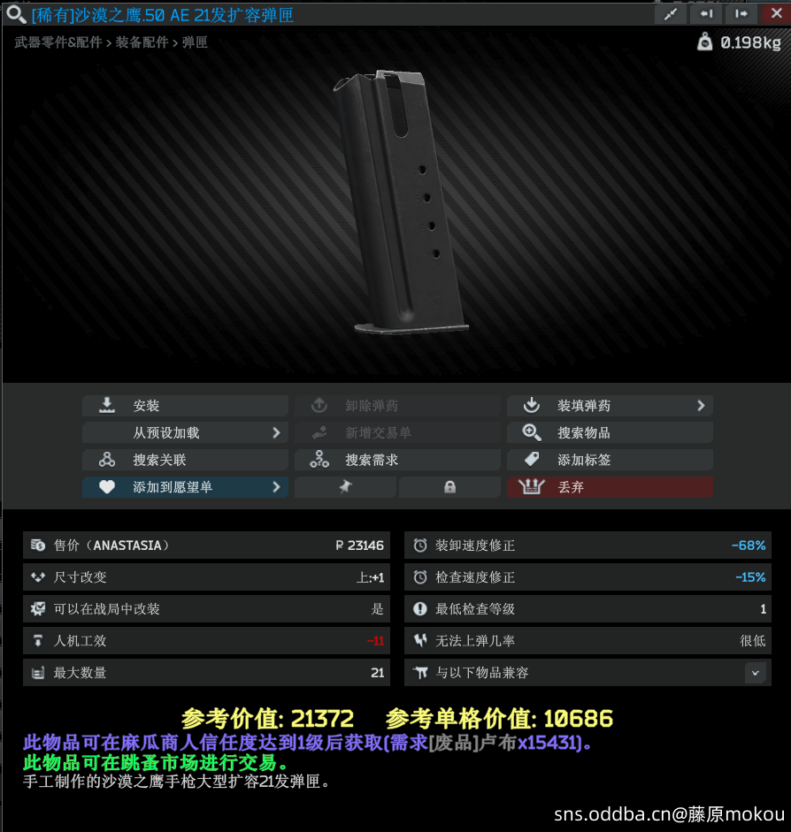 21发大型扩容弹匣,占地1×2,装上后沙鹰占格会变成2×2