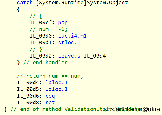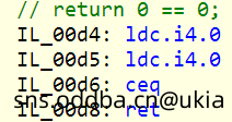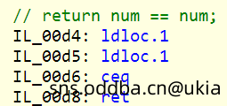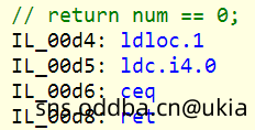 在IL代码中,它们分别代表 ldloc.1 (加载局部变量1)和 ldc.i4.0(压入常量 0),它们组成了相等判断的两项.