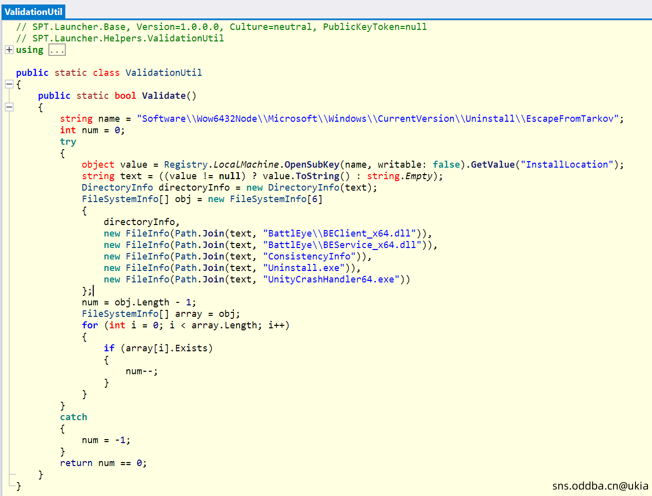 我们首先利用ILSpy工具找到验证函数的代码,它在这里(同样的源码已经由SPT团队开源,可以看到几乎一致)