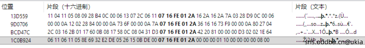 那就简单了,DE 00 07 16 FE 01 2A那条就是我们要找的字节序列