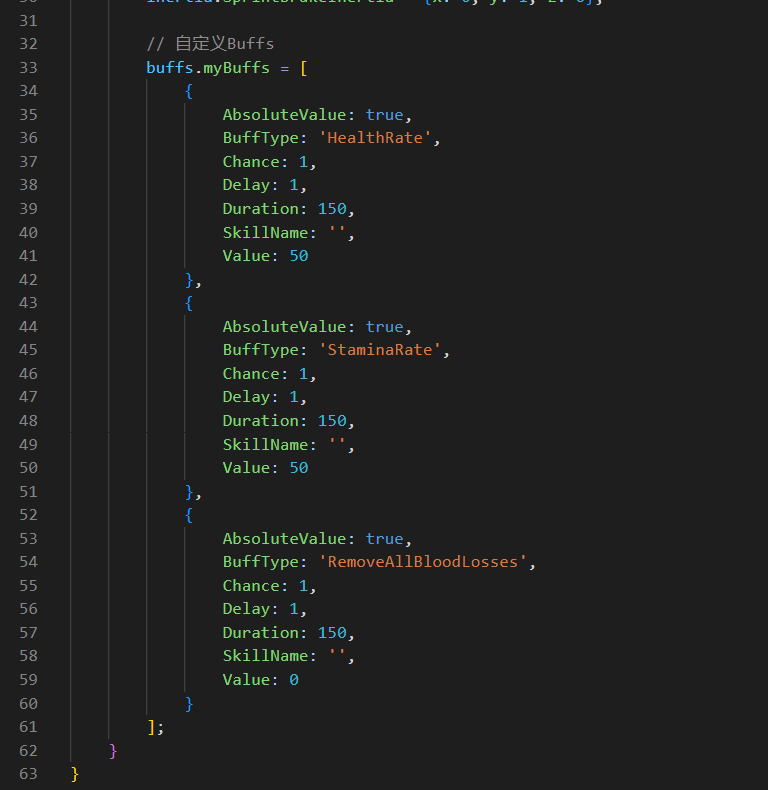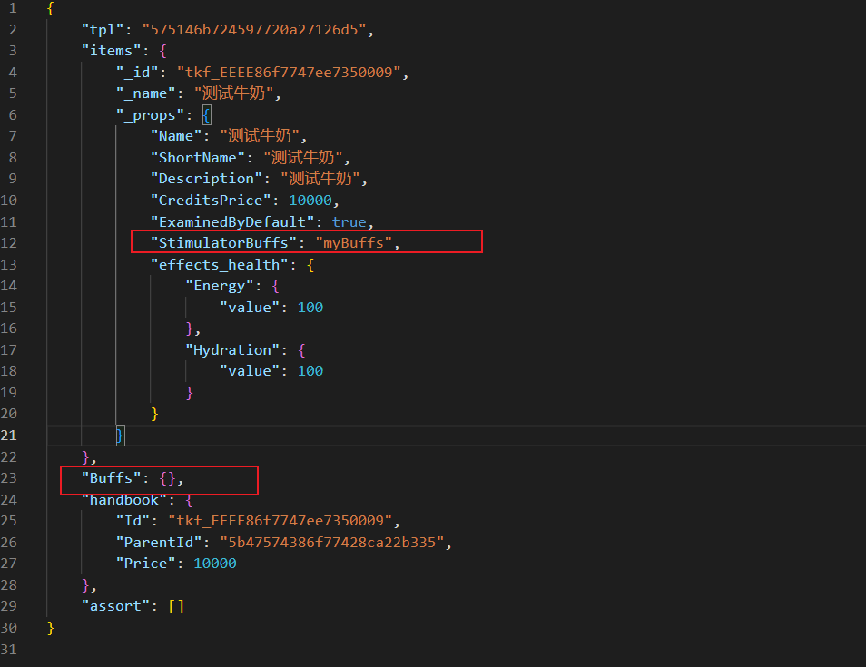 注意:如果要增加Buffs,不用在独立物品文件的Buffs中填写内容,而是在_props.StimulatorBuffs 中填写一个自定义名称来引用;然后在extend/Globals的js文件中增加同名的自定义Buffs。Buffs可任意搭配,如下图