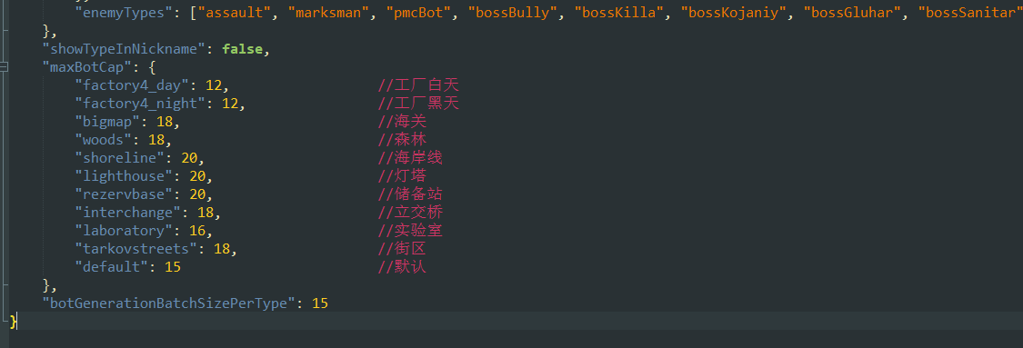 拉到最下面,有一个maxBotCap,里面的数字就对应各个地图里的最大ai数(scav+boss+pmc),打死一个另一个地方随机出生一个。 根据自己电脑配置来,多了容易卡。