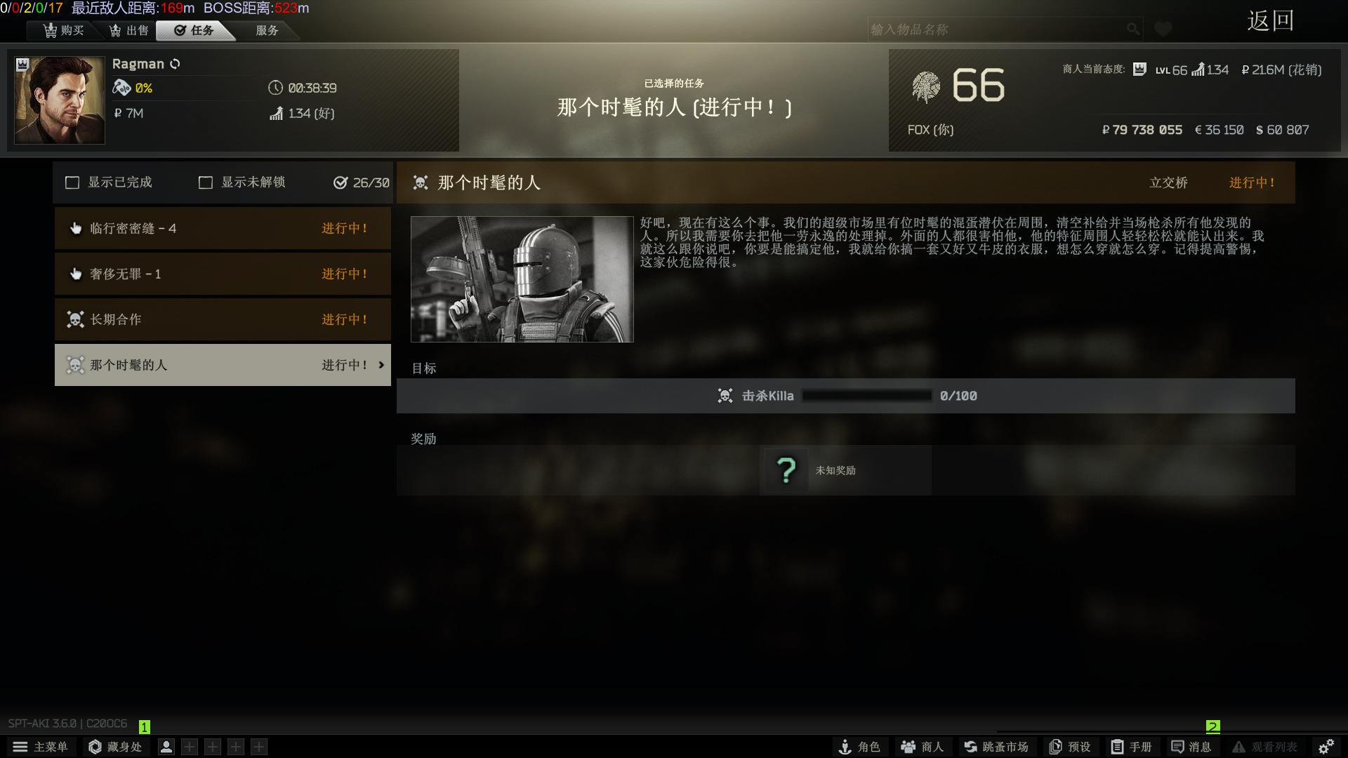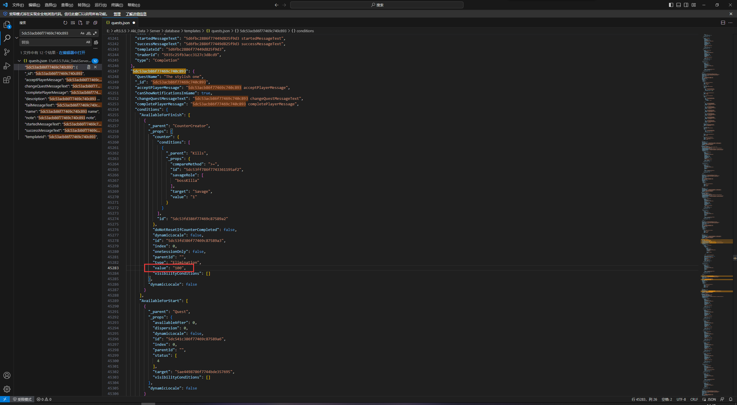 前面这位说的直接改任务完成也是可以的,方法就是打开存档文件,同样搜5dc53acb86f77469c740c893,有好几个,找到下面有"status": 2,这个值的,把这个2改成3就是任务完成可交任务状态。
